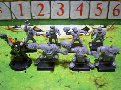 | ブラッドボウルってのは、ゲームズワークショップって会社から発売している、アメフトとかいうのに似ている、ミニチュアを使った、二人用の対戦ボードゲームでし。 遊ぶ二人がそれぞれ、オールド・ワールドって呼ばれる世界の住人の種族から一つを選んでチームを作るでし。人間やオーク、エルフやドワーフと様々な種族が参加するでしよ。わしらゴブリンも、オークやトロールと一緒にゲームを行なっているでし。 互いのチームができたら、フィールドとかピッチって呼ばれる試合場のボードを出して、選手を並べるでし。んで、順番こに選手を動かして、一個っきゃないボールを奪い合って、相手チームの陣地の端っこにボールを持っていけばタッチダウンっていって得点が入るでし! ゲーム中にいっぱいタッチダウンしたほうが勝ちなゲームでしよ。 |