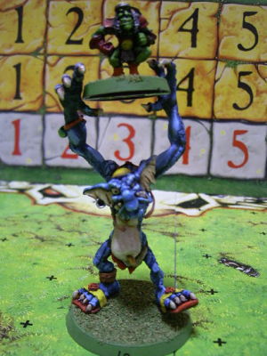 | トロールとかミノタウロスは、ビッグガイってところに分類されるでし。 ビッグガイは普通の選手の種類と違って、一つのチームに一人しか雇えないでし。さらにビッグガイはビッグガイと同盟しているチームにしか入らないでし。 例えば、クレキシゴールはリザードマン・チームにしか雇われないでし。オーガは、ヒューマンかケイオスかノース・チームにしか雇われないとかでし。 これの例外が、ハーフリング・チームとゴブリン・チームでし。ハーフリング・チームはツリーマンを、ゴブリン・チームはトロールを、最大で2体まで雇う事ができるでし。 ビッグガイは、その名が示すとおりデカイ奴らでし。当然、パワフルな試合を行なうでし。でも、奴らは普段チームの練習に参加しないでしから、チームリロールを使えないって弱点もあるでし。 良い所も悪いところもあるでしが、チームメイトを投げるなんて芸当もやってのけるビッグガイは花があるでしよ。だからオーナー連中はこぞっていれるでしね。でも食べられちゃいそうで怖いから早く下ろしてほしいでしっ! |